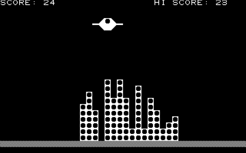 | "You are the commander of an alien space ship. You must destroy the cities below. On destroying a city, the next city will be larger and your ship's speed will increase." I don't have any information about this game but given the filetype is $11 and the homebrew made by T. Kemp tends to have that filetype as well then this could possibly be another homebrew game by T. Kemp. | ||