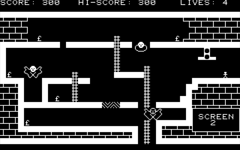 | "You must collect as many money bags (£) as possible without getting killed." I have to say, this is a really impressive platform game - probably the closest the MZ has come to having a game on a par with Manic Miner / Jet Set Willy. | ||